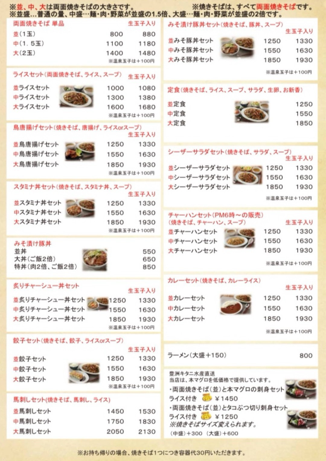 お持ち帰りの際は焼きそば1つにつき容器代30円頂きます。 |