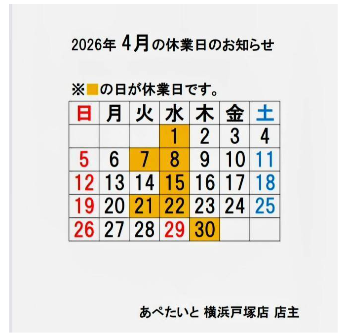 | 定休日 | 第1火曜日(祝日の場合は営業し、第1木曜日を休業とさせていただきます) 毎週水曜日(祝日の場合は営業し、翌日を休業とさせていただきます) |
